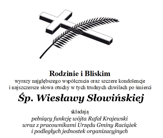 | edytowane: | data: 18:56, 02.01.2022 | przez: Marek Smoliński | KONDOLENCJE DLA RODZINY WÓJT WIESŁAWY SŁOWIŃSKIEJ | |