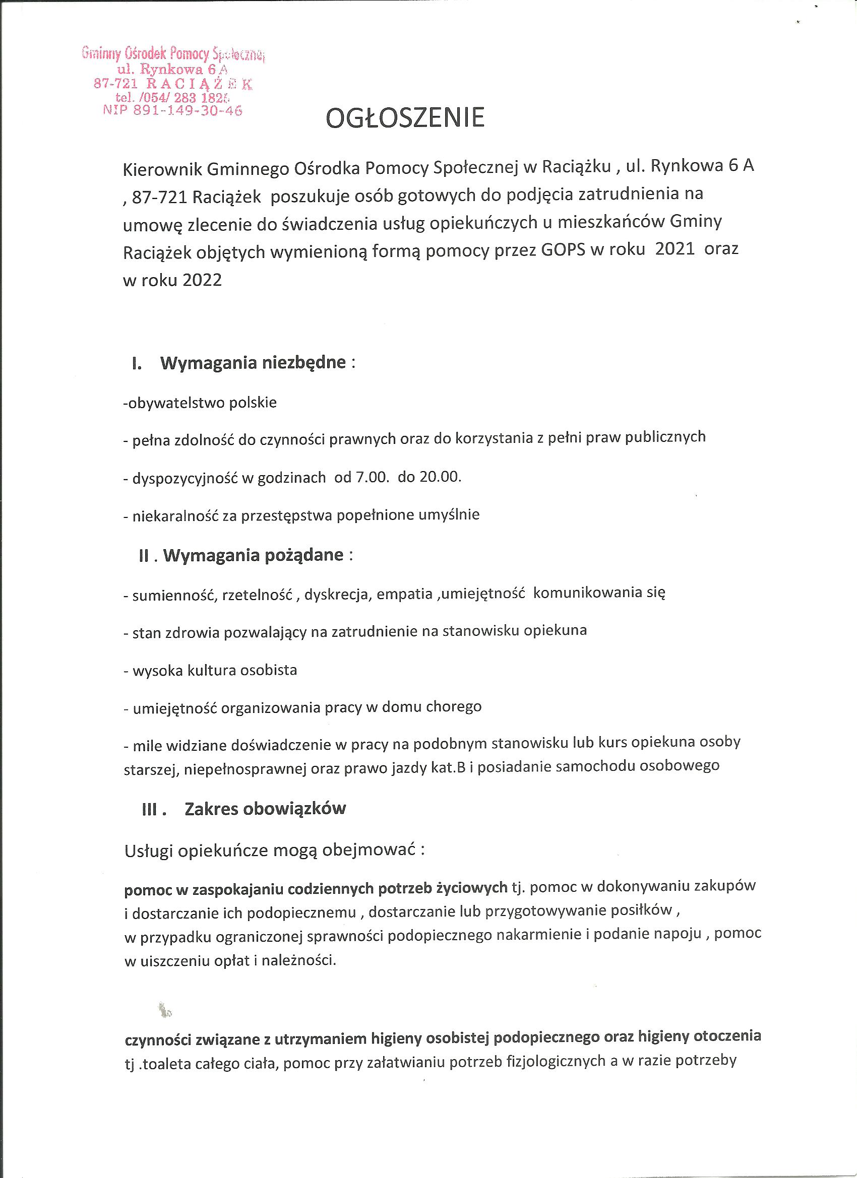 | Ogłoszenie na stanowisko opiekun świadczący uslugi opiekuńcze - cz.2 (Rozmiar: 388 kB, JPG) | dodany: 12:44, 09.11.2021 | przez: Marek Smoliński | |